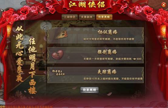 强制离婚:只需一方花费500元宝即可离婚,无需另一方同意。
