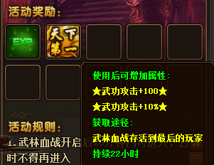 玩家角色等级达到50级后,活动大厅内就会开放武林血战的一个乱斗竞技场。