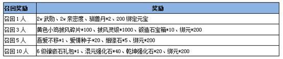 3) 邀请福利: 邀请本服老玩家回归游戏,被召唤的玩家可在回归界面输入邀请码,当召唤人数达到指定数量时即可领取召唤奖励