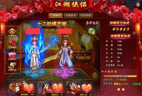 夫妻副本,只属于侠侣之间的副本,副本内掉落请密度卷轴和姻缘石,这些都是升级夫妻等阶的必要物品。