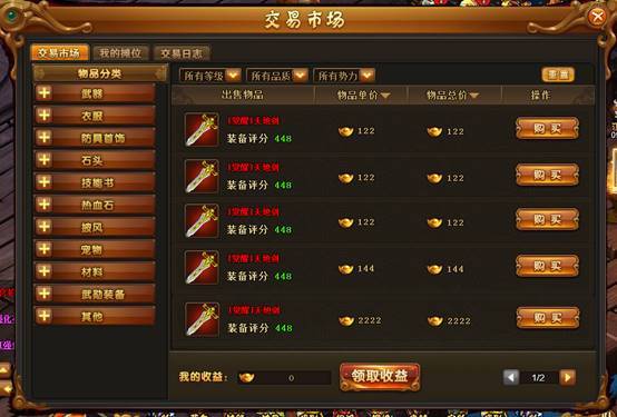 玩家在背包里可以左级物品,通过挂绶功能,将自己的想出售的物品放在市场上,同时